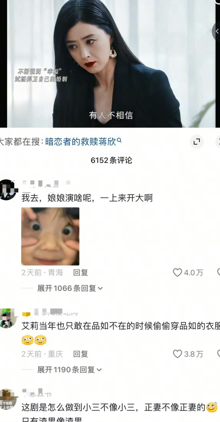 再说说那个气场,真的绝了!一般电视剧里的小三都是唯唯诺诺、偷偷摸摸,可蒋欣演的安妮,光明正大地挑衅,采访时对着原配句句带刺,同框时眼神里全是戏,那种飒爽又狡黠的劲儿,把“嚣张”刻进了骨子里。反观王珞丹饰演的正宫,一脸错愕和慌乱,反而被衬得有点小家子气,网友都说“蒋欣这气场,说她是正宫我都信”。