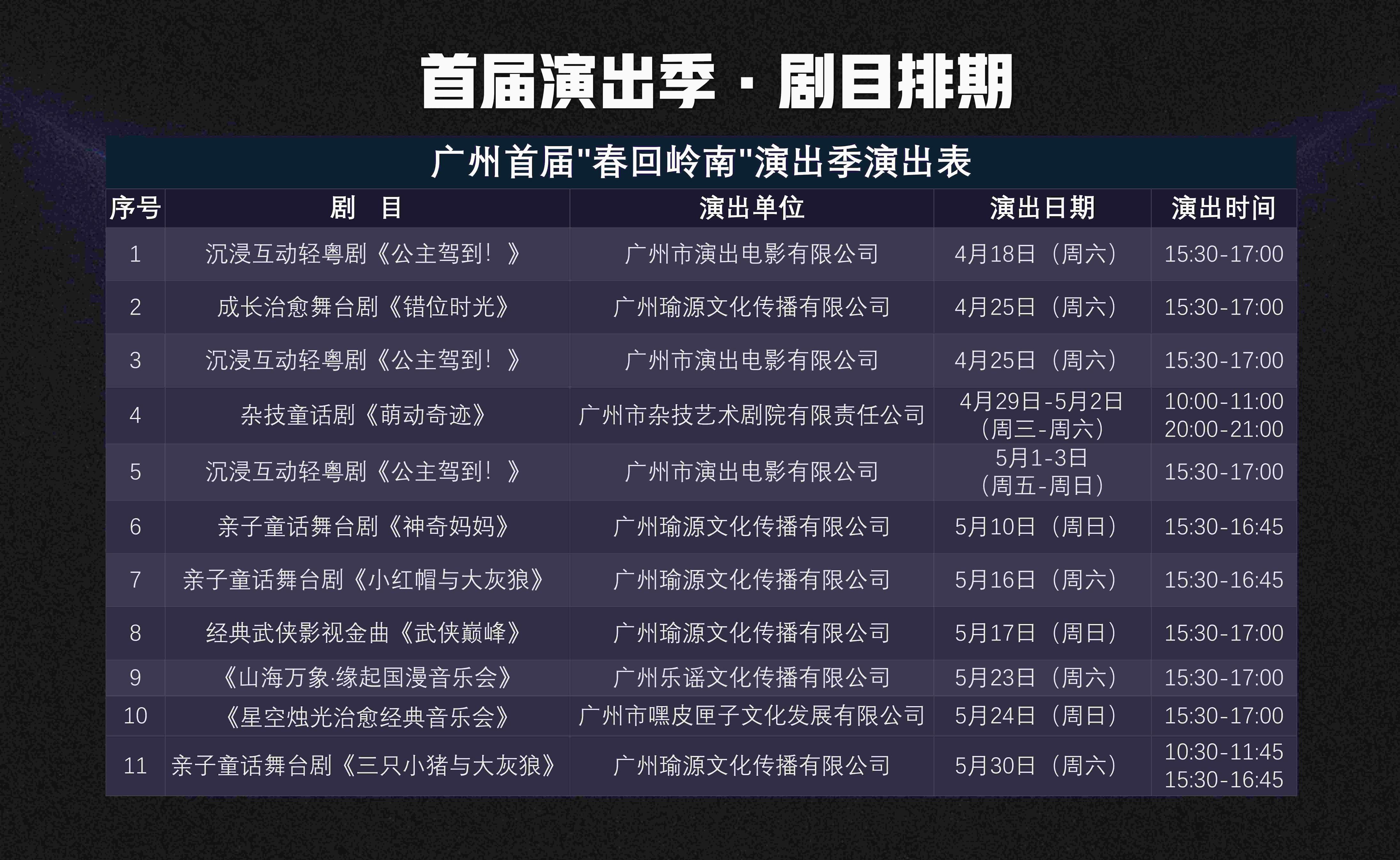 本届演出季剧目参与单位包括:广州市演出电影有限公司、湾区策动(广州)影业投资有限公司、广州杂技团艺术剧院有限责任公司、广州粤剧院有限公司、广州瑜源文化传播有限公司、广州乐谣文化传播有限公司、广州市嘿皮匣子文化发展有限公司等,构建专业多元的演出矩阵,共同保障演出内容的专业品质与艺术水准。
